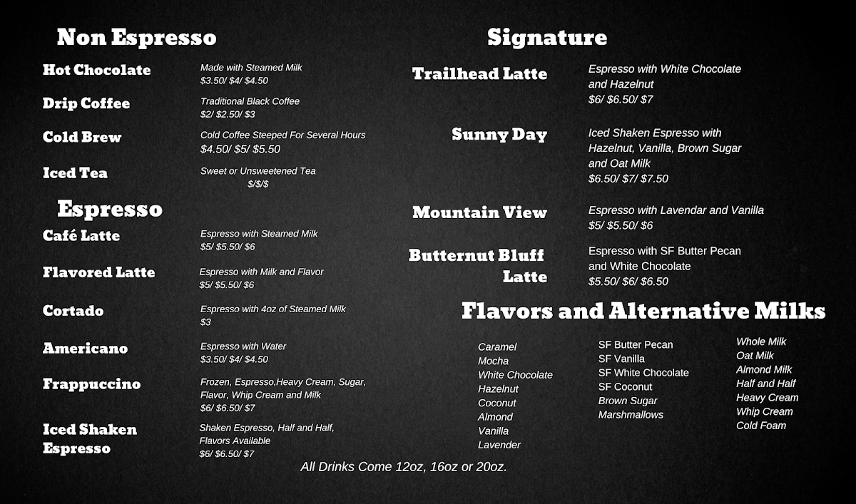 A smooth blend of creamy white chocolate and rich hazelnut, the Trailhead Latte is your perfect pick-me-up—warm, cozy, and ready for any adventure. Available hot or iced.