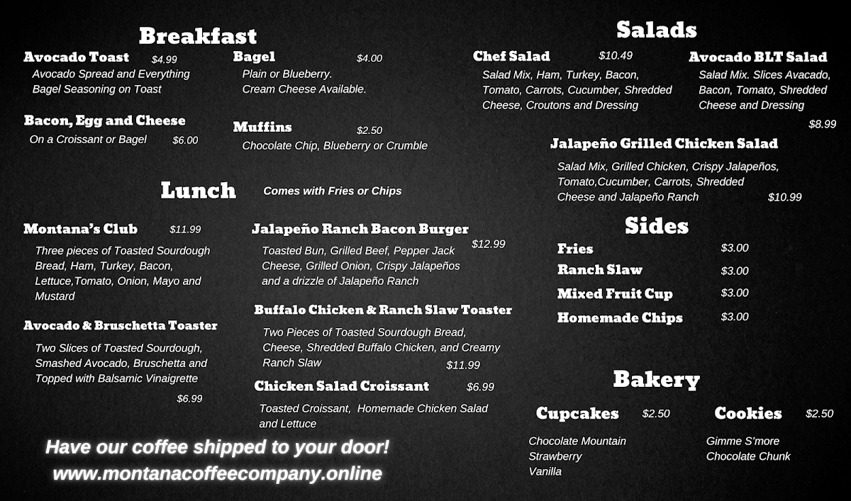 Introducing the menu at Montana Coffee Company, located in Fayetteville, TN, you’ll discover a delightful blend of high-quality coffee and hearty cafe-style food that has quickly earned rave reviews from locals. Patrons consistently praise the inviting atmosphere created by friendly staff, making every visit a warm experience.